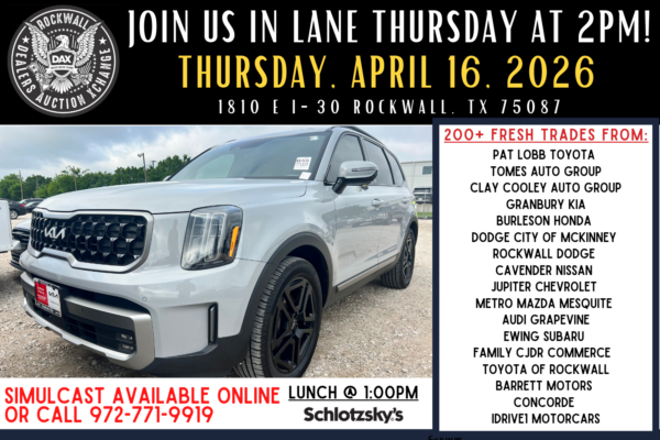 Start reviewing the upcoming DAX sale inventory each week on Fridays to find fresh Texas trades and fleet units from some of the Lone Star State’s most successful new car franchises. View complete condition reports on late model qualifying units with an array of pictures with Black Book link for pricing.